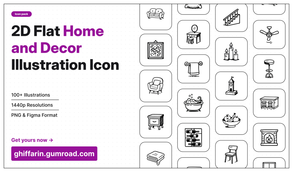 You’ll get 50+ 2D flat home and decor icons in PNG and Figma Format, organized by room categories and ready for personal or commercial use.